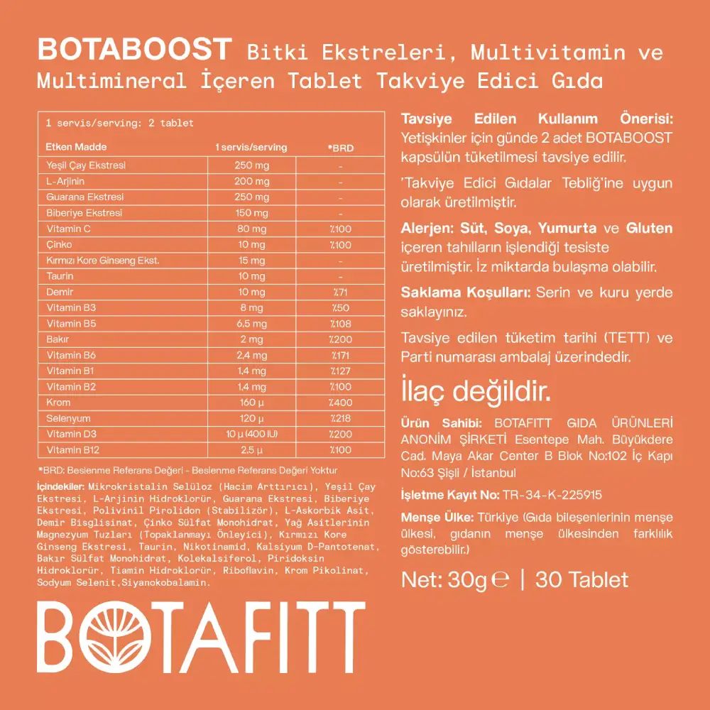 Botaboost, guarana, yeşil çay, biberiye ekstresi, Kore ginsengi, demir, bakır sülfat ve C vitamini içerir. Guarana ekstresi, enerji seviyesine destek sağlayan doğal bir bileşendir. Yeşil çay, termojenik etkisiyle yağ metabolizmasında yer alabilir. Kore ginsengi, yorgunluğa karşı kullanılan bir bileşendir. Demir, bakır sülfat ve C vitamini, oksijen taşıma süreçlerine katkı sağlayabilir.